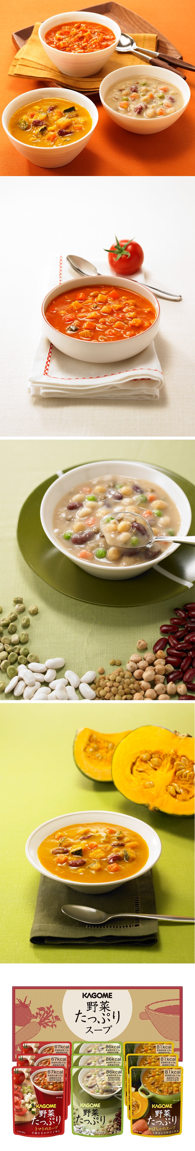 野菜の旨みを活かした、トマト、豆、かぼちゃのスープの3種の味わいが手軽に楽しめます。