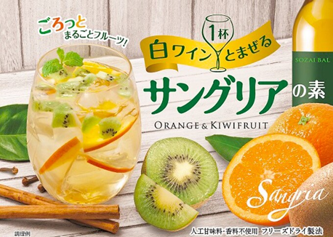 キウイとオレンジの果肉入り。白ワインを注いで爽やかな味わいが楽しめます。夏は氷や炭酸と、冬はレンジで温めてホットワインに!