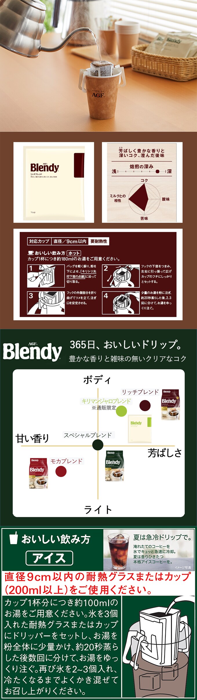 365日おいしいドリップ。「Blendy(ブレンディ)」 レギュラー・コーヒー ドリップパックは、豊かな香りと、雑味のないクリアなコクが最後のひとくちまで続く、マグカップでお楽しみいただけるドリップコーヒーです。バランスの取れた味わいなので、毎日のドリップ生活をお楽しみいただけます。AGF(エージーエフ) 「ブレンディ」 レギュラーコーヒー ドリップパック リッチブレンド8袋は、芳ばしい香りと重厚なコク、キレのある澄んだ後味。豊かな苦みとほのかな甘さが、ミルクにもよく合うブレンドです。1杯1杯がいつも新鮮な個包装タイプ。開封したとき、淹れているとき、そして飲むとき。「ブレンディ」 ドリップパックは様々な段階のコーヒーの香りで、あなたのリラックスタイムを一層豊かに演出します。 コーヒー豆の焙煎から充填まで全て国内の工場で生産し、繊細な日本人の味覚に合わせて開発したドリップコーヒーです。