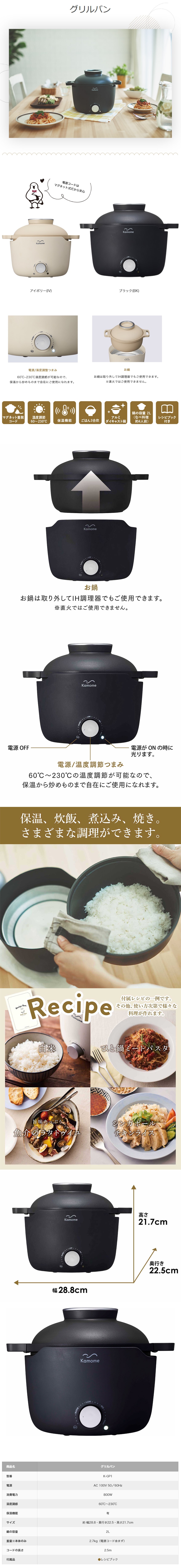[ブラック] Kamome/グリルパン (レシピブック付)|「保温」「炊飯」「煮込み」「焼き」さまざまな調理ができる万能グリル鍋!厚手のアルミダイキャスト鍋は冷めにくいので、料理の温かさを長時間保つ