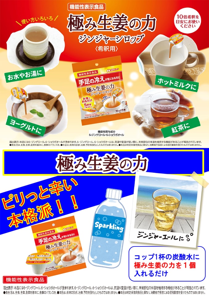 生姜の辛みを活かした個包装濃縮液体タイプの商品です。お湯や炭酸水、牛乳などで割ることでおいしくお召し上がりいただけます。※注意:辛味の強い製品ですので直接の飲用はお避けください。 届出表示:本品には6-ジンゲロール、6-ショウガオールが含まれます。6-ジンゲロール、6-ショウガオールは、気温や室温が低い際に、末梢部位の体温を維持する機能があることが報告されています。