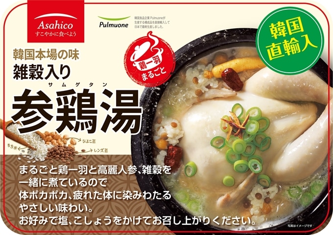 原材料 : チキンスープ(鶏足、玉ねぎ、にんにく、大根、食塩、もち米粉、生姜、こしょう、朝鮮人参)、骨付鶏肉、もち米、ひよこ豆、レンズ豆、ナツメ/調味料(核酸)