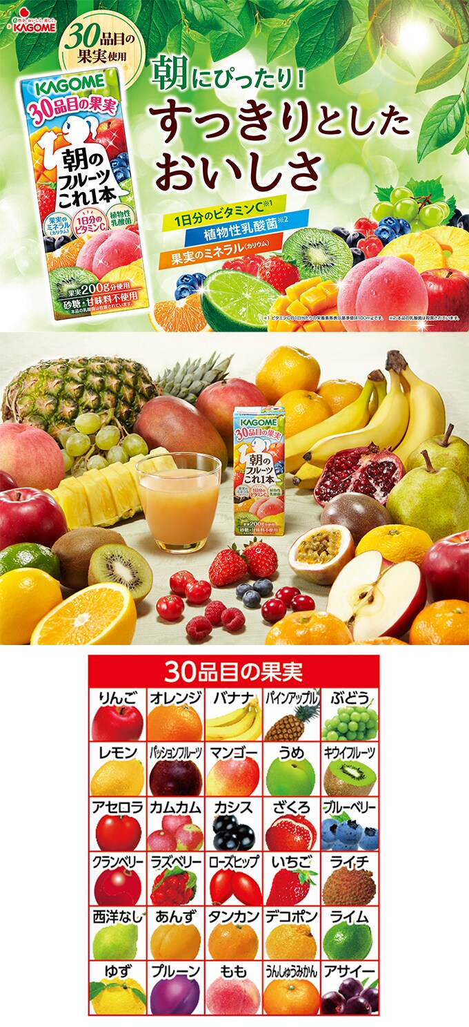 ◆カゴメ 朝のフルーツこれ一本200mlは朝にうれしい健康果実30品目を使用。
