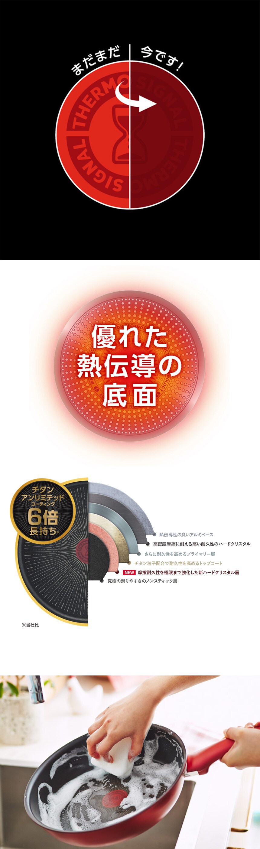 ティファール史上最高峰の耐久性を実現した「チタン・アンリミテッドコーティング」で、使い始めのこびりつきにくさが長く続きます。