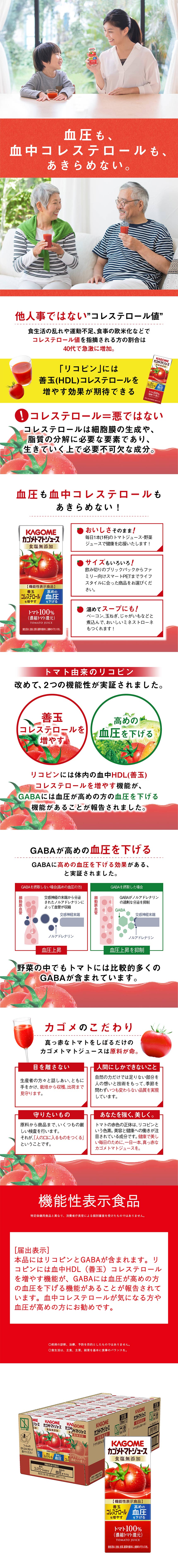 完熟トマトをぎゅっと濃縮したトマト100%飲料です。1.6倍のトマトを使用し、更に高リコピントマトを加えることでリコピン量が2倍(※)です。トマトのしっかりとしたコクがあり、料理用途にも適した味わいです。トマトのうち、高リコピントマトは40%使用しています。※「カゴメ トマトジュース食塩無添加」200ml対比