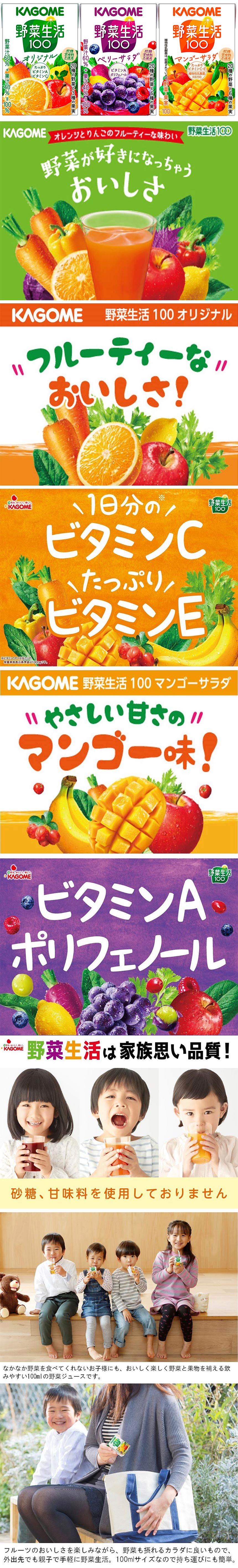 100mlの野菜生活オリジナル4本、ベリーサラダ4本、マンゴーサラダ4本の計12本×3箱(計36本)のアソートセットです。その時の気分にあわせてお好きなものをチョイス、飲みきりサイズでちょうどいいサイズです。