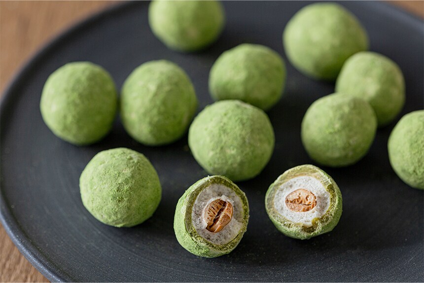 「抹茶ぼーる」には一番茶の抹茶を贅沢に使い、抹茶のほろ苦さときな粉と大豆のやさしい甘さが広がる自慢の逸品。