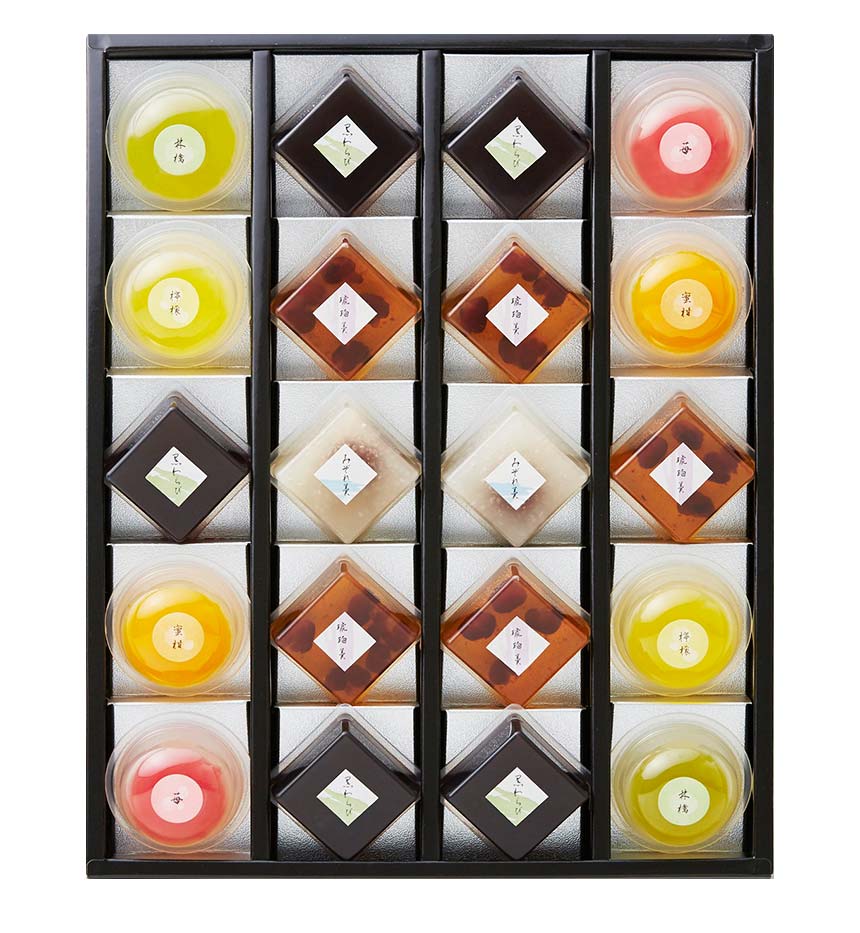 <琥珀羹>砂糖(国内製造)、鹿の子豆(砂糖、小豆、還元水飴)、糖蜜、寒天、果糖ぶどう糖液糖/ゲル化剤(増粘多糖類)、ソルビット