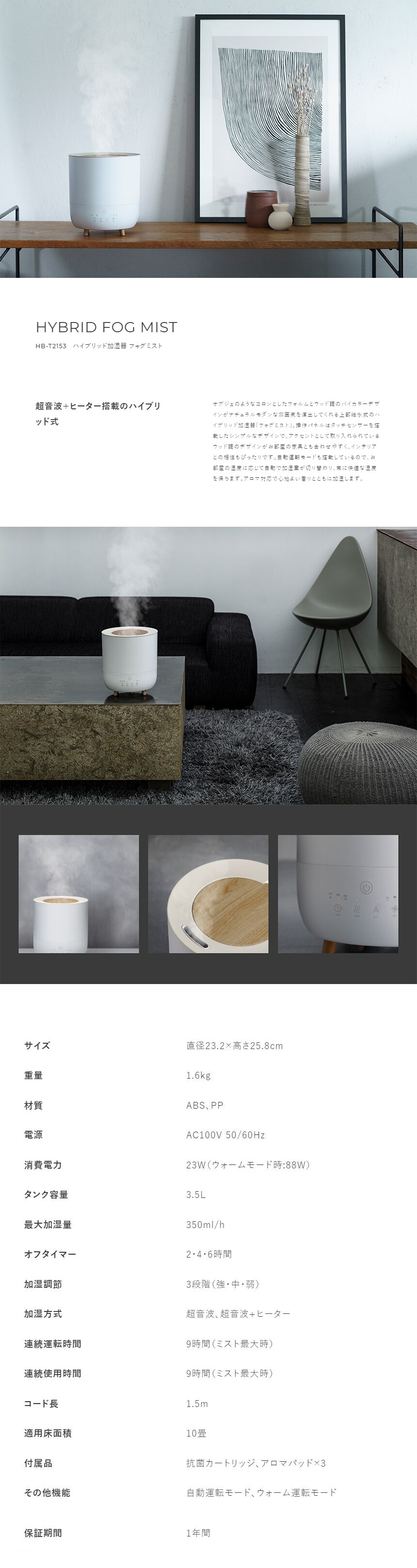 ※お届けの商品は【[ホワイト] Three-up(スリーアップ)/ハイブリッド加湿器 フォグミスト/HB-T2153WH】となります。