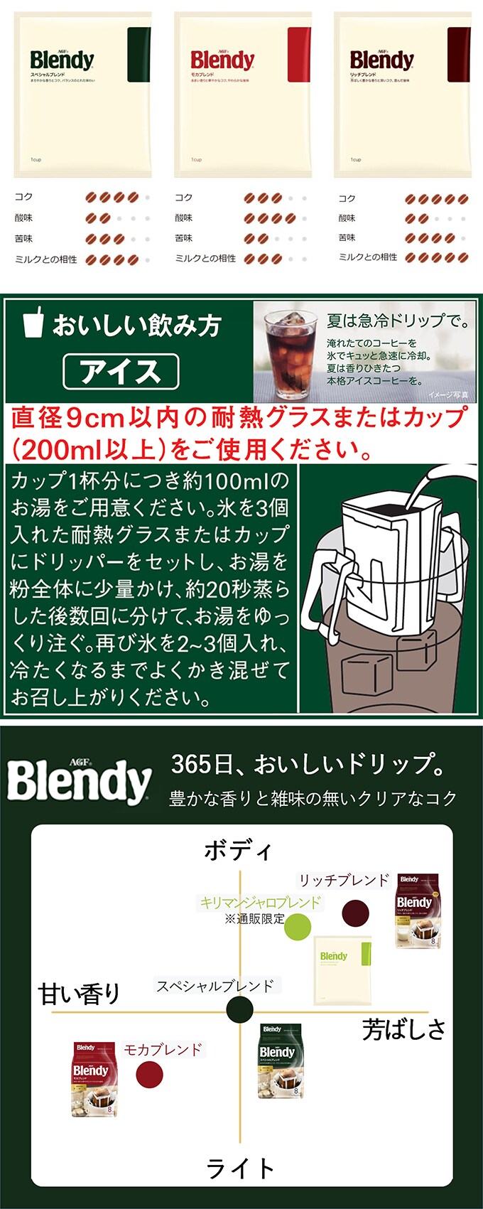 3種類の味わいが楽しめる、「ブレンディ」ドリップコーヒーのアソートタイプ、オフィスやご自宅でたくさん消費される方に最適なドリップコーヒーのお得な大容量サイズです。1杯1杯がいつも新鮮な個包装タイプ。開封したとき、淹れているとき、そして飲むとき。「ブレンディ」 ドリップパックは様々な段階のコーヒーの香りで、あなたのリラックスタイムを一層豊かに演出します。アソートだから気分に合わせてバラエティ豊かなコーヒーをお楽しみにいただけます。コーヒー豆の焙煎から充填まで国内の工場で生産しています。