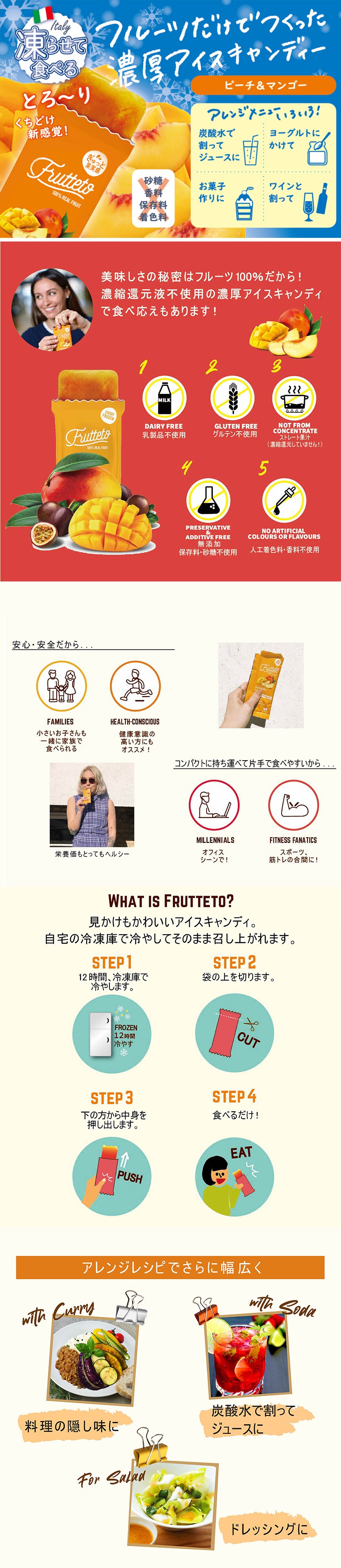 [計40本]リブインコンフォート フルッテート ピーチ&マンゴー 40g×5本×8袋 | 一年中おいしい!凍らせて、そのままソースで、アレンジさまざま!果実100%無添加アイスキャンディ!