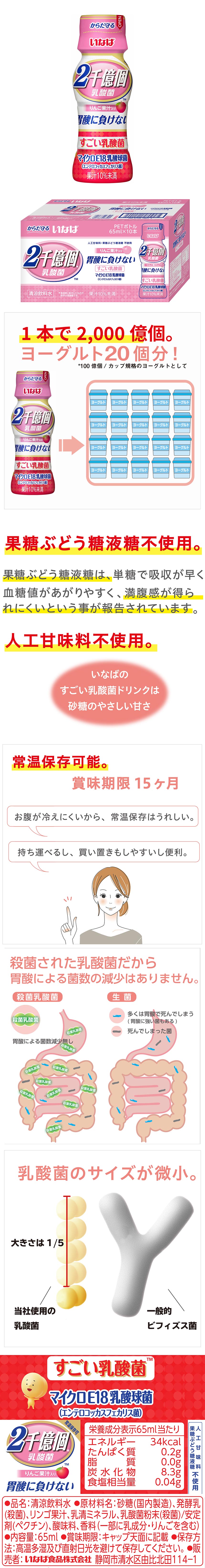 マイクロE18乳酸球菌を2千億個配合しました。1本でヨーグルト20個分の乳酸菌を摂ることができます。(100億個/カップとして)。一般的な乳酸菌と比べて約1/5と小さく、また、殺菌乳酸菌のため胃酸で減ることがなく、効率よく吸収されます。毎日飲んでも飽きない、爽やかな甘さに仕上げました。常温で保存可能のため、持ち運びもしやすい商品です。2千億個の乳酸菌が毎日の健康をサポートします! りんご味。