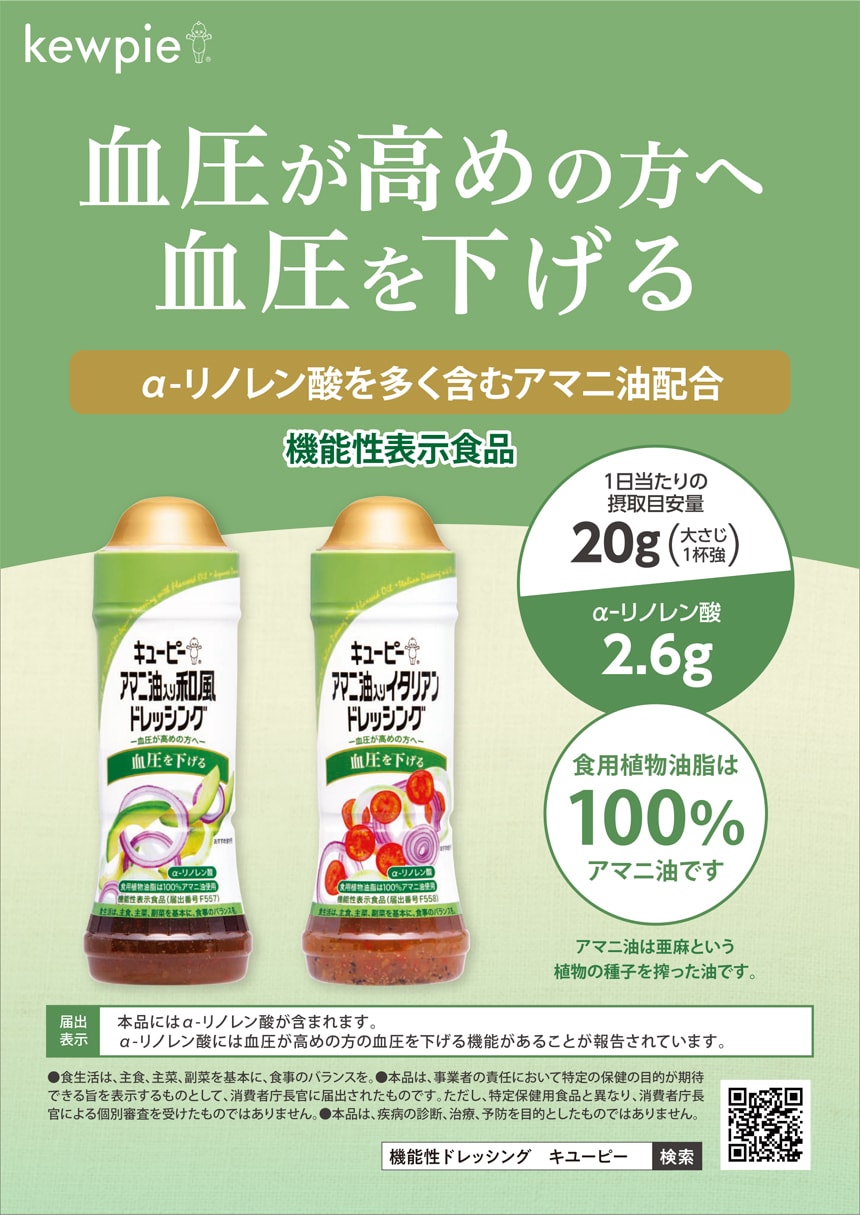 血圧が高めの方に対し血圧を下げる機能があることが報告されているα‐リノレン酸を含む、機能性表示食品のドレッシングです。