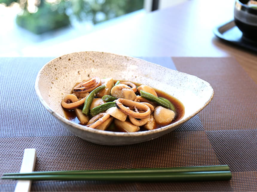 柔らか食感のイカと里芋を、たまり醤油を使ったつゆで仕上げました。深い味わいとイカの旨味を愉しめます。
