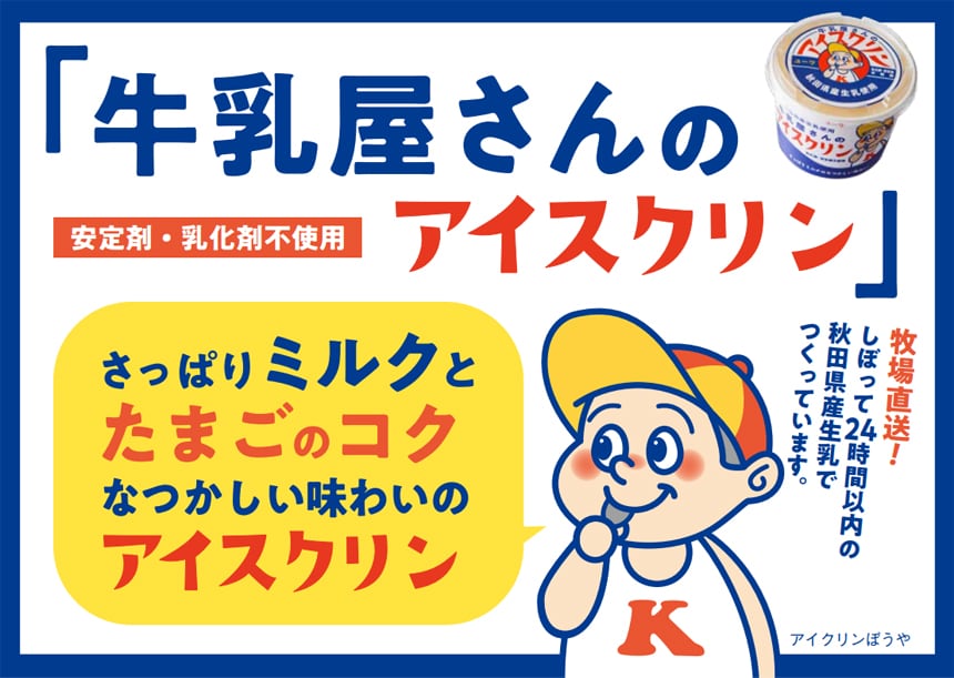 牧場直送の朝搾りたて秋田県産生乳でつくりました。昔アイスクリンを食べた方も、初めて食べる方も、なんだか懐かしい気持ちになるようなアイスです。