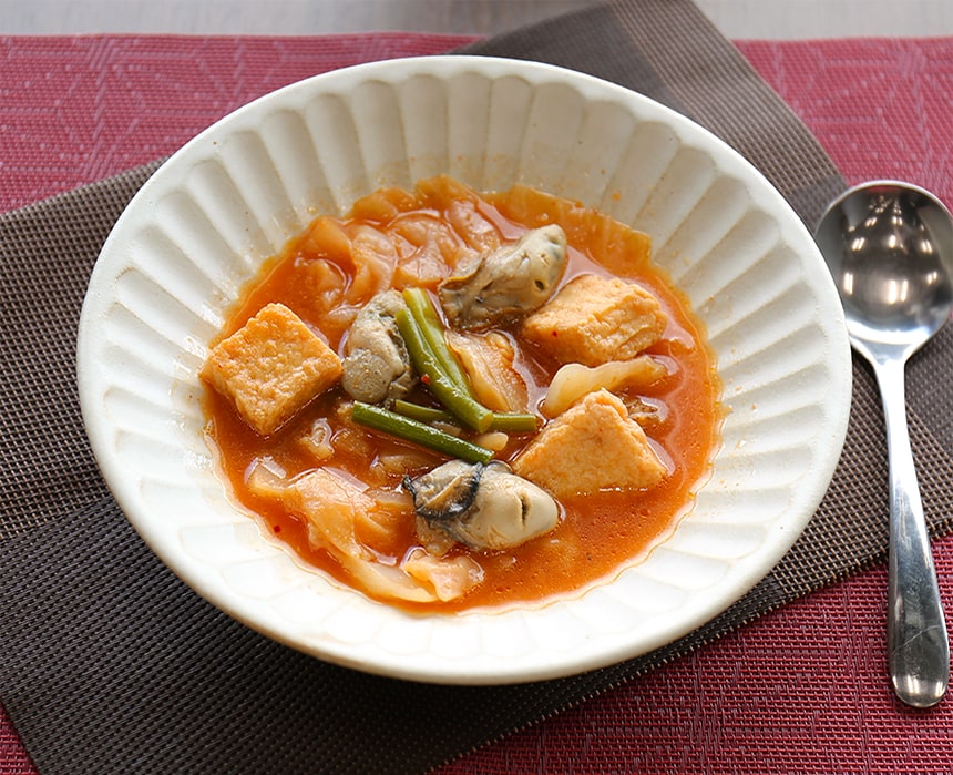 素材のおいしさそのままの生牡蠣を、コクが後を引くコチュジャン入りのスープで煮込む、身体温まるメニューです。