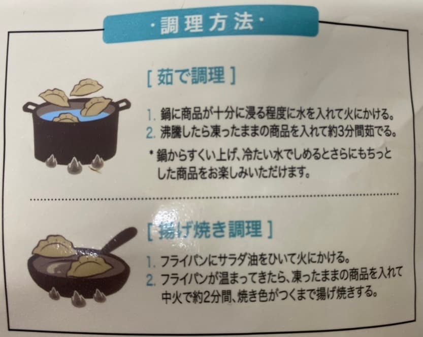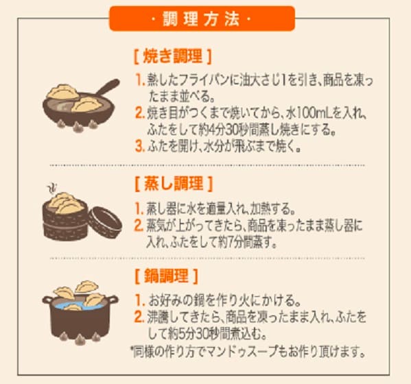 野菜(キャベツ、ねぎ、はくさい、にら、にんにく)、豚肉、ラード、豆腐、粒状大豆たん白、ごま油、しょうゆ、食塩、砂糖、シーズニング、牛肉だしの素、酵母エキス、生姜粉、こしょう、でん粉加工品、皮(小麦粉、小麦グルテン、食塩、大豆油) / 加工でん粉、調味料(アミノ酸等)、pH調整剤、増粘剤(キサンタンガム)、香料、酸味料、甘味料(ステビア抽出物)、(一部に小麦・乳成分・牛肉・ごま・大豆・豚肉を含む)