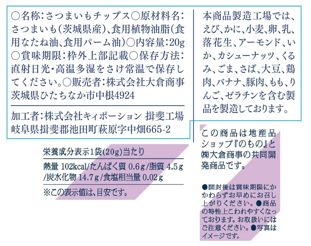 茨城県産のさつまいもを使った、厚切りチップス。味付けなしなので、さつまいもの甘さそのままです。