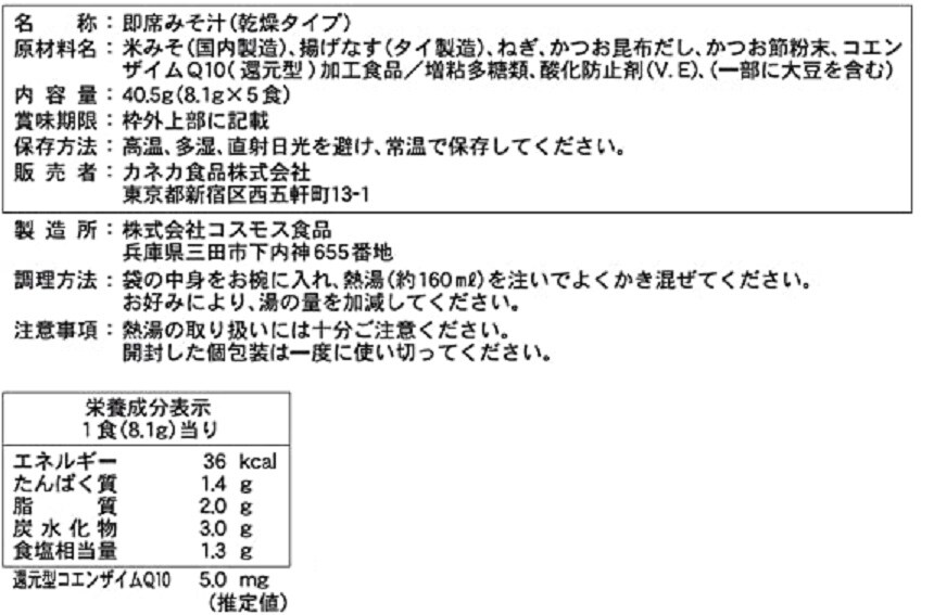 毎日の元気な体づくりをサポートする 「還元型コエンザイムQ10」を配合した、健康留意型フリーズドライみそ汁!