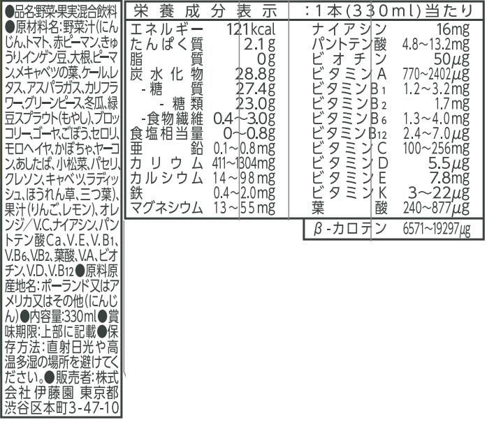 ●にんじんをベースに30種類の野菜とりんご、オレンジ等の果実をブレンドし、すっきり飲みやすく仕上げました。