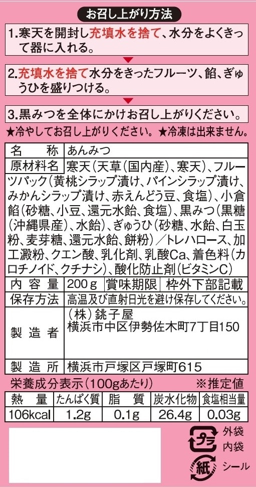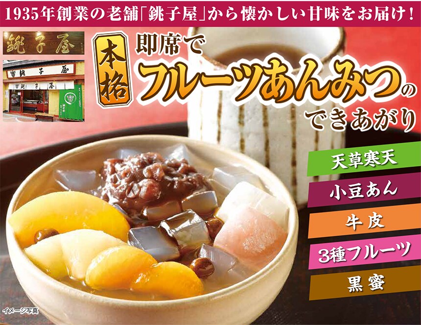 天草使用の銚子屋オリジナル寒天に、小倉あん、沖縄黒糖使用の黒みつ、紅白の牛皮、赤えんどうのみつ豆、黄桃・みかん・パインを入れたフルーツまでセット。