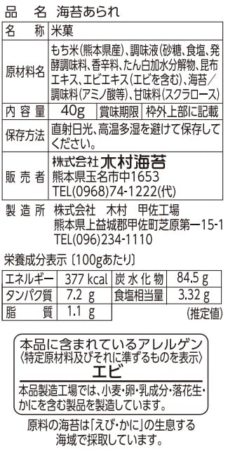 [24袋]木村海苔 火の国育ちの海苔あられ 40g | 老舗海苔メーカーの秘伝のタレを使用した、熊本県産100%のもち米のあられ。
