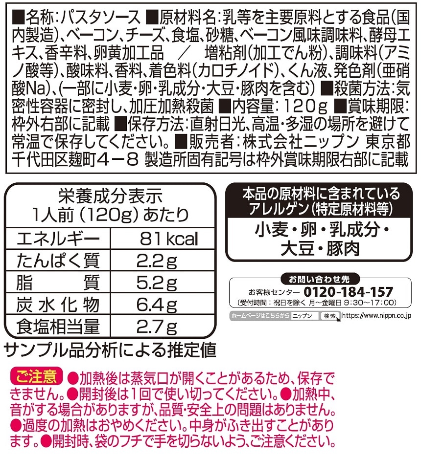 [24個]ニップン オーマイ レンジでカルボナーラ 120g | 電子レンジで約30秒加熱して喫食可能な1人前パスタソース(湯煎調理も可能)です。