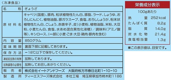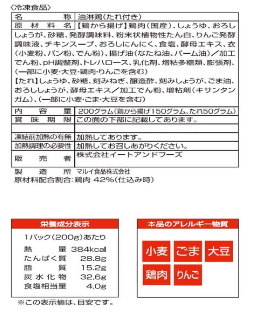 【たれ】しょうゆ、砂糖、果糖ぶどう糖液糖、発酵調味液、みそ、植物油脂、醸造酢、食塩、おろしにんにく、たん白加水分解物、ごま、しょうが、香辛料/増粘剤(加工でん粉、増粘多糖類)、酒精、調味料(アミノ酸等)、(一部に小麦・ごま・大豆を含む)