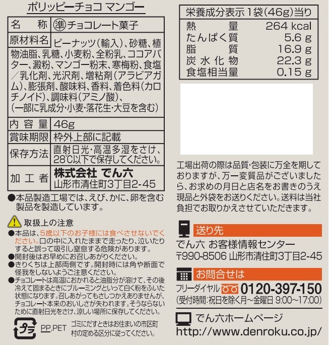 香ばしいピーナッツをサクサク食感の生地と、マンゴー味のチョコレートでつつみました。