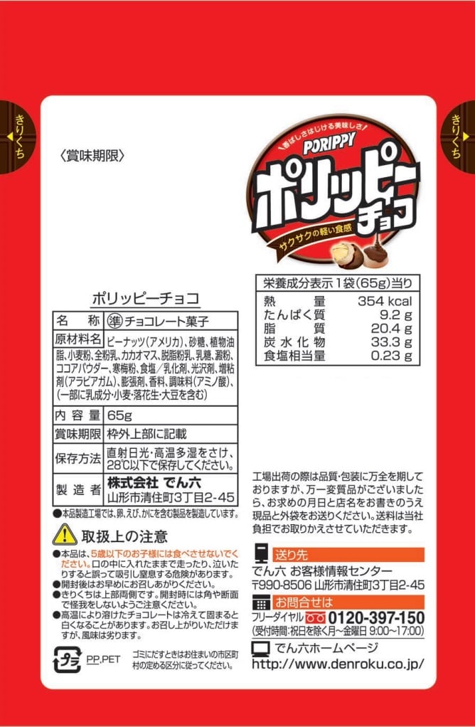 [72個]でん六 ポリッピーチョコ 65g | 香ばしいピーナッツをサクサク食感の生地とまろやかなチョコでコーティングしました。