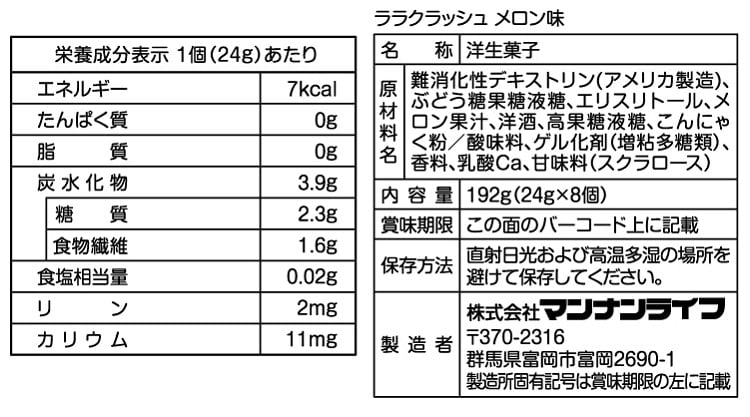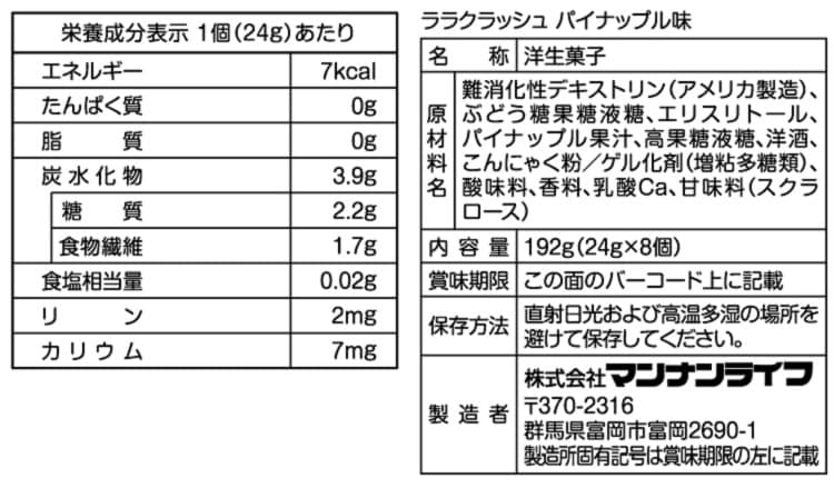 1個(24g)あたり食物繊維1.6g配合、カロリーはたったの7kcal。