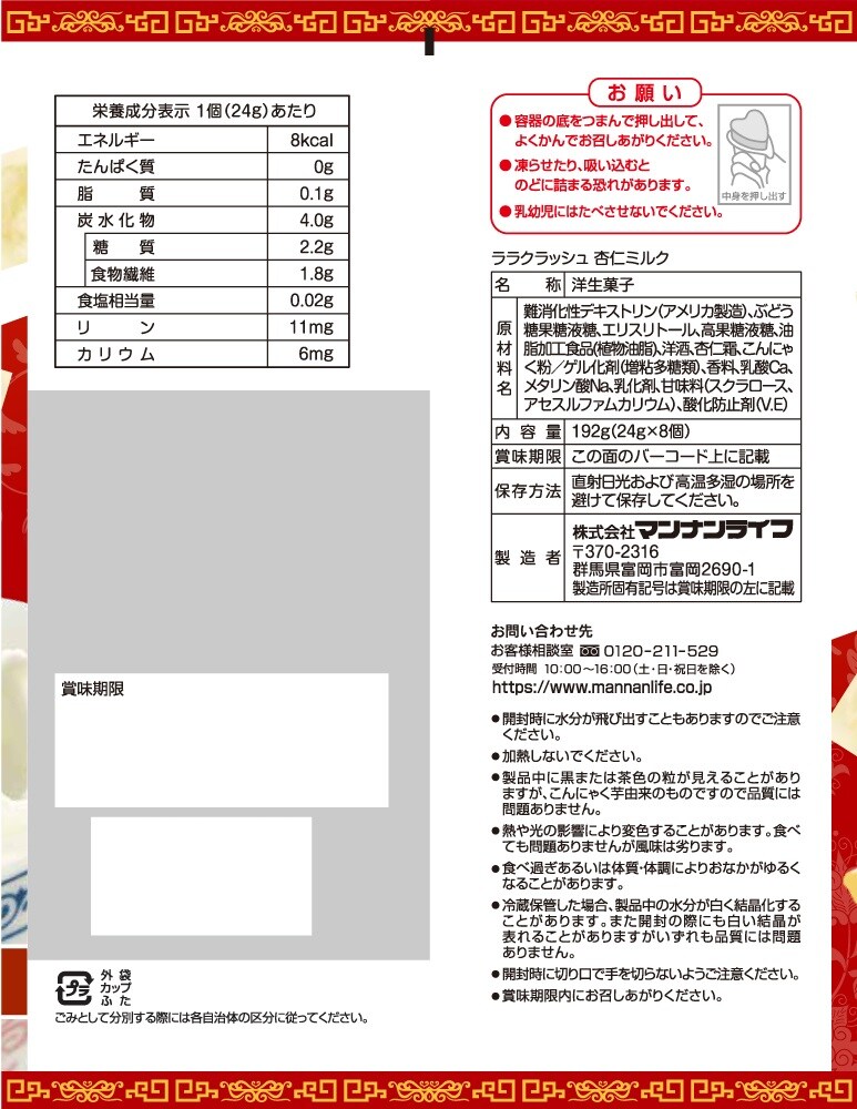 - ・ララクラッシュ 杏仁ミルク 192g(24g×8個)×12袋 (賞味期限:2023/01/02)