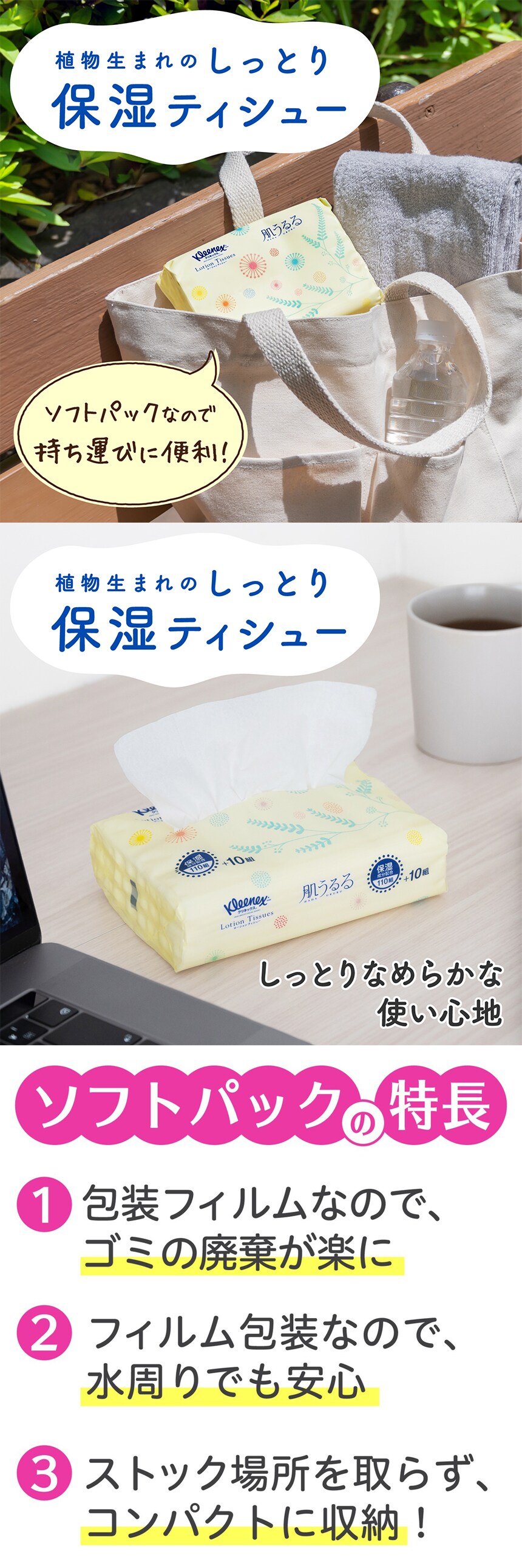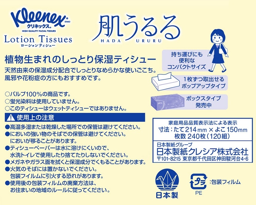 ●天然由来の植物性保湿成分を配合。厳選パルプ原料を使用した、クリネックスのローションティシューです。