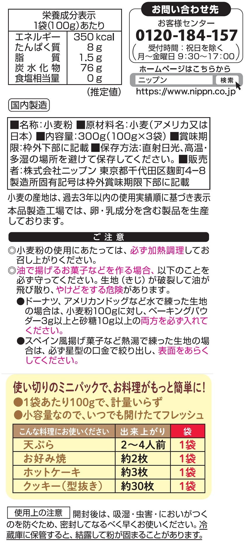 計量が面倒、キッチンが汚れる、保管に場所をとる、虫付きの心配などの不満点を解消した使い切りタイプの薄力粉です。