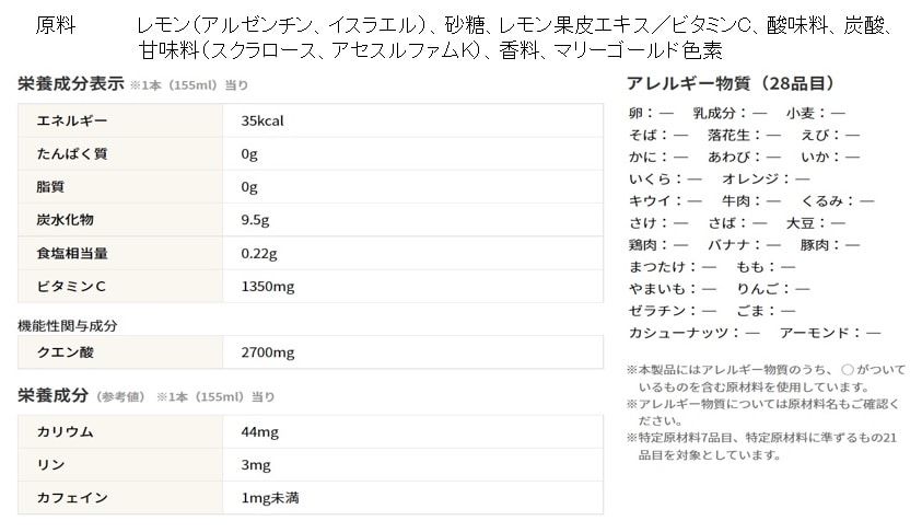 レモン1個分の果汁、ビタミンC1350mg、日常生活や運動後の疲労感を軽減するクエン酸(機能性関与成分)が2700mg入った「機能性表示食品の小瓶ドリンク」です。