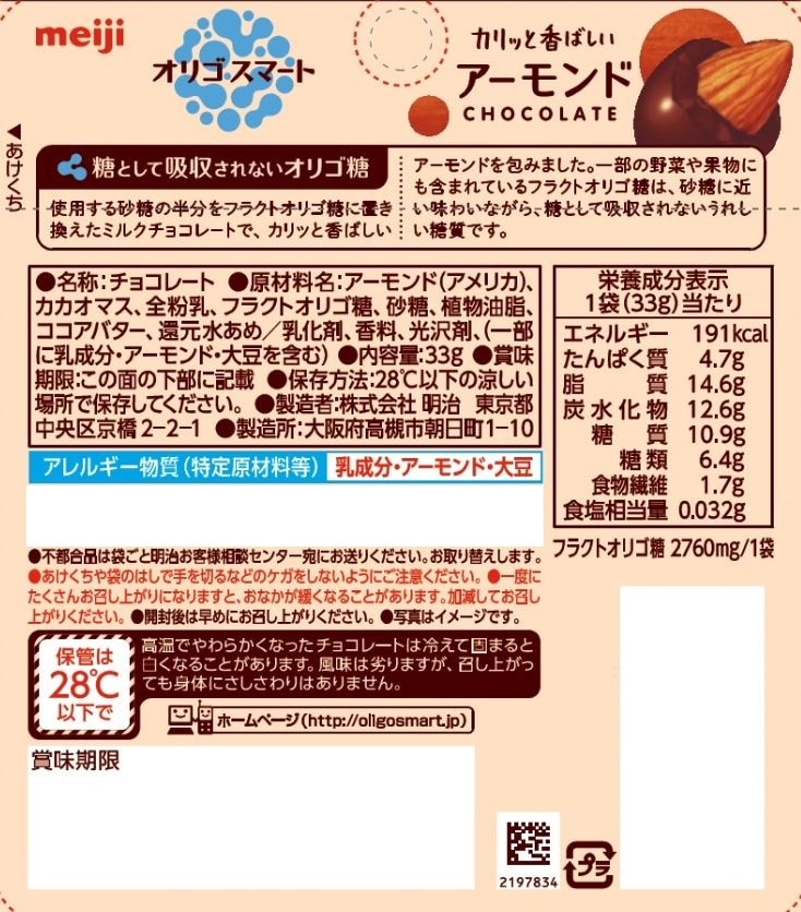 [40個]明治 オリゴスマート アーモンドパウチ 33g | 使用する砂糖の半分を「フラクトオリゴ糖」に置き換えた、糖から健康を考えたアーモンドチョコレート。