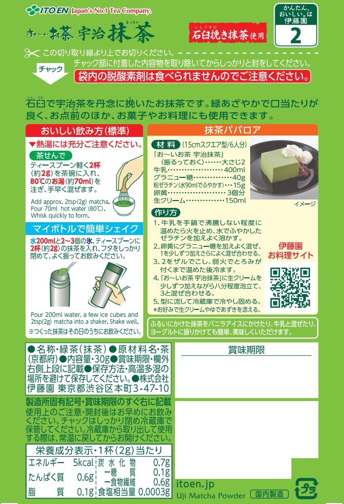 [30袋]伊藤園 お~いお茶 宇治抹茶 30g | 宇治の碾茶を丹念に石臼で挽いた本格的な抹茶です。