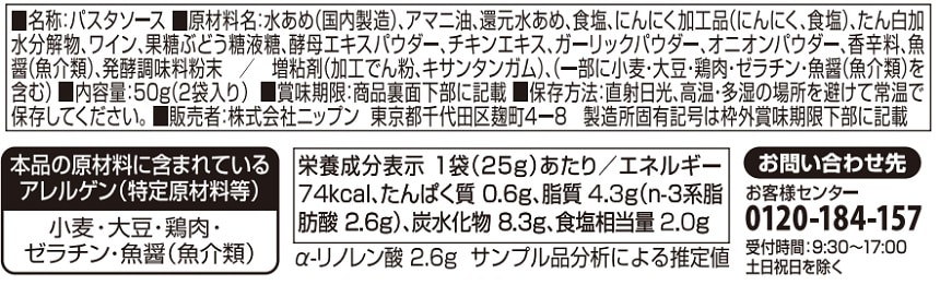 自然の恵みシリーズから、1食使い切りの手作りパスタ用ソースが登場。油はアマニ油を使用する事で1食分で1日分のオメガ3(αリノレン酸)が摂取出来る仕様。