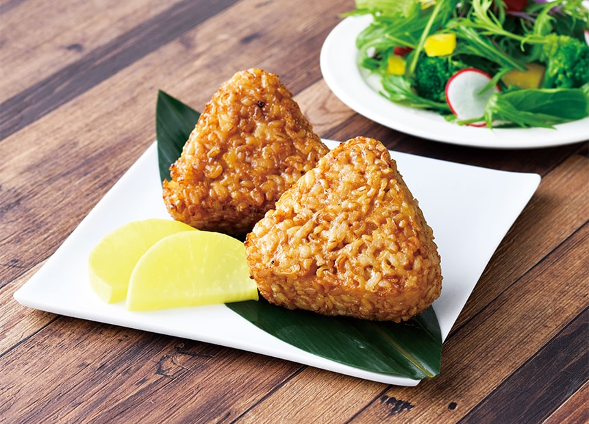 炊きあがったご飯に木樽天然醸造濃口醤油を混ぜた後、表面にも吹き付けて2回焼いた、玄米入り焼おにぎりです。
