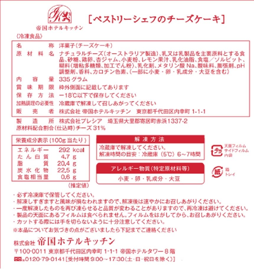 - [冷凍]【4個】帝国ホテルキッチン ペストリーシェフのチーズケーキ 335g