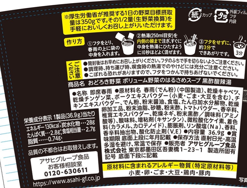 - ・おどろき野菜 ボリューム野菜のはるさめスープ 黒酢酸辣湯 36.9g×12個(賞味期限:2023/04/30)