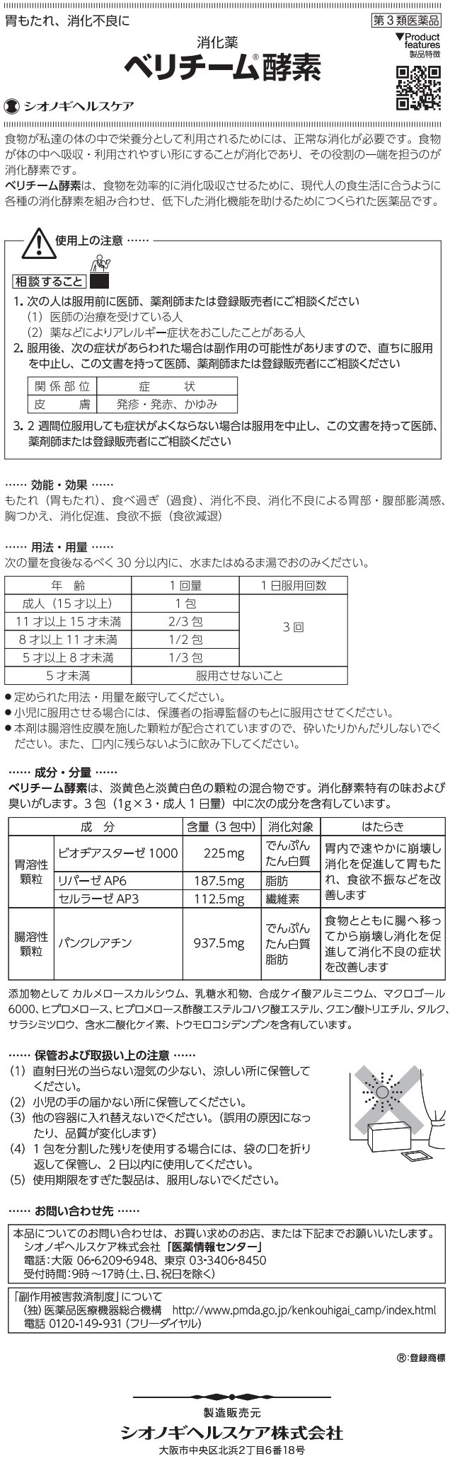 [計45包]【第3類医薬品】シオノギヘルスケア ベリチーム酵素 9包入×5個 | 食べた物を速攻分解!食べ過ぎ、胃もたれ、食欲不振に