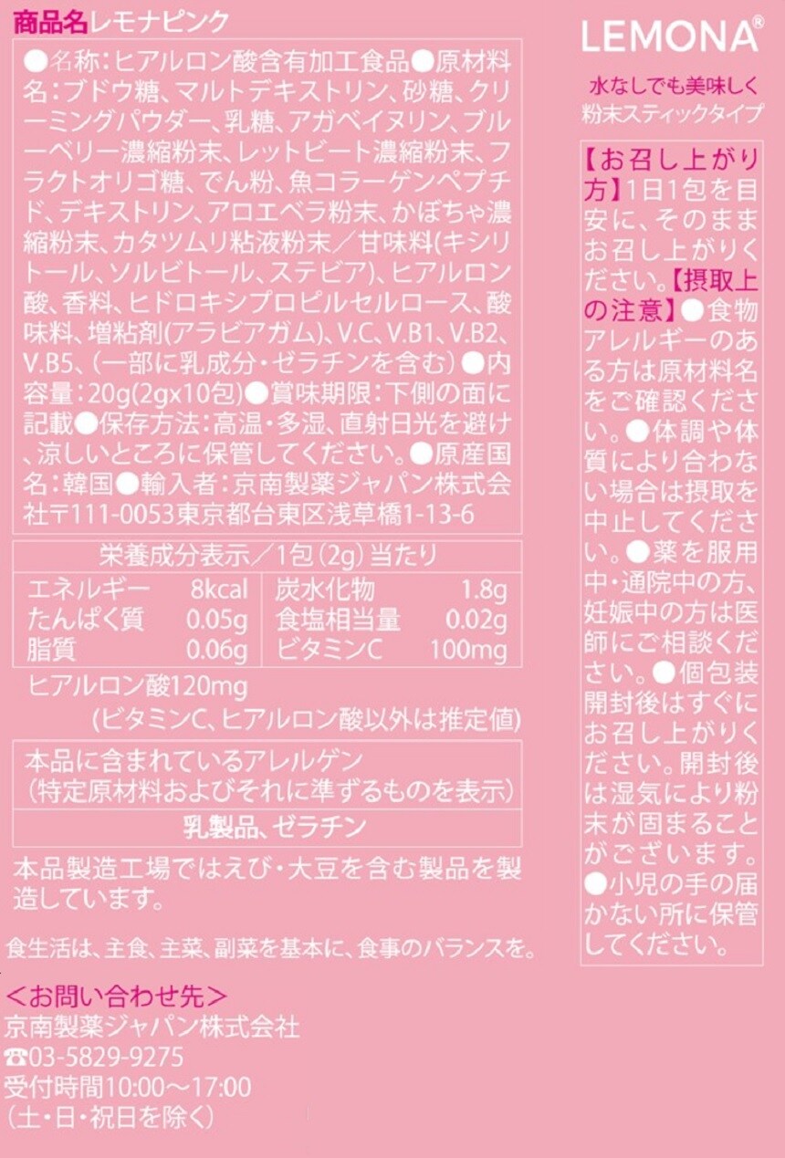 その【レモナ】にヒアルロン酸とコラーゲンを配合。健康と美容を同時に摂取できちゃう優れもの!