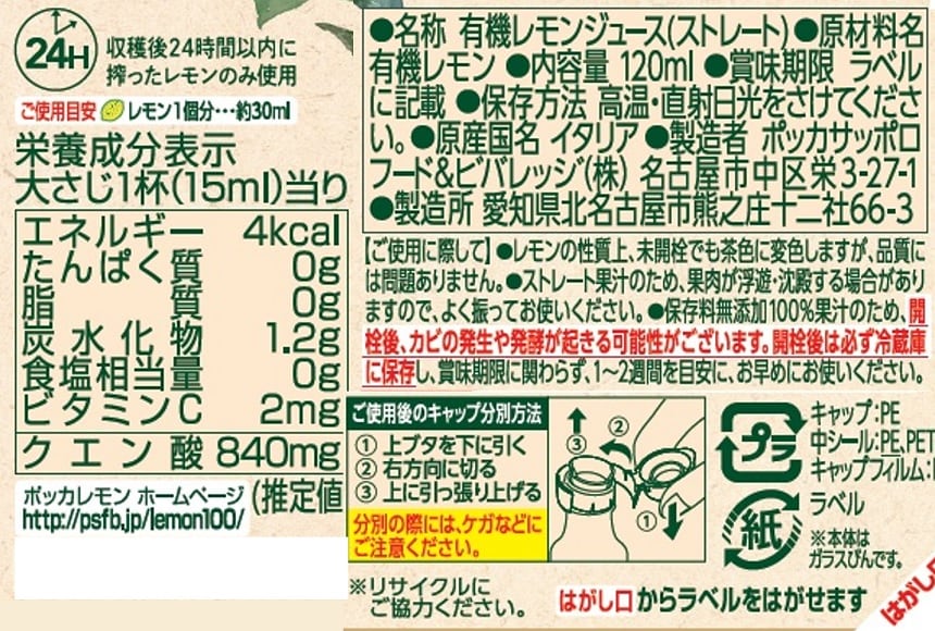 - ポッカレモン 有機レモン シチリア産ストレート果汁100% 瓶 120ml