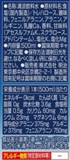 アラニン・アルギニン・フェニルアラニン混合物1500mg、カリウム60mg、カルシウム23mg、マグネシウム6mg配合。ハイポトニック設計。カロリーゼロ。