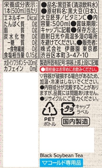 大豆イソフラボンを5~20mg(1本=500ml当たり)含んだカロリー・カフェインゼロの黒豆茶飲料です。