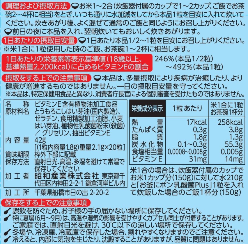 炊飯時にポンと1粒入れるだけで、いつものご飯で手軽に乳酸菌とビタミンEが摂取できます。