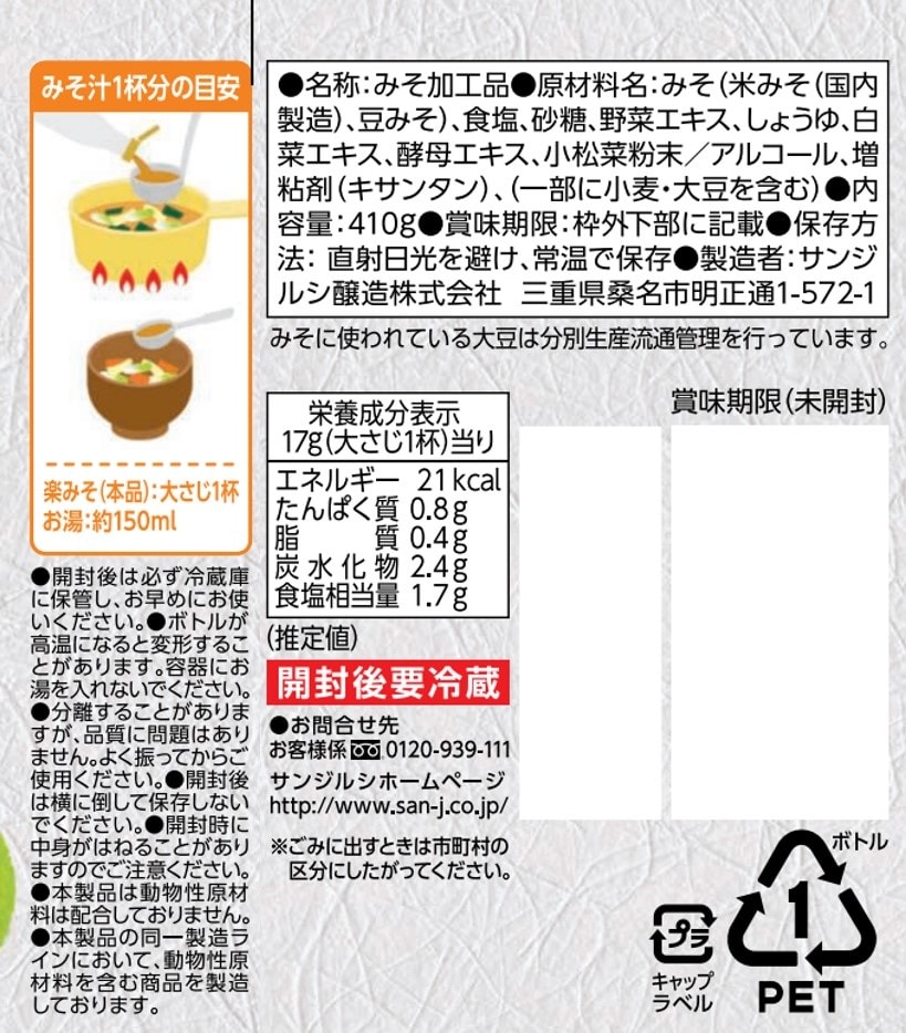 [2種計12個]サンジルシ醸造 楽みそ野菜だし入り合わせみそ 410g/料亭赤だしお料理みそ 450g