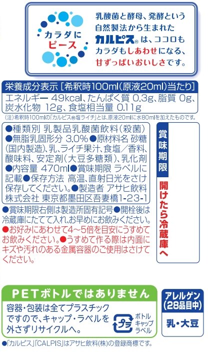 【初回限定】[12本]アサヒ飲料 カルピス 塩ライチ コンク 470ml | 甘ずっぱくて、みずみずしい味わい。塩分を加えココロとカラダが潤う夏にぴったりな塩ライチ味