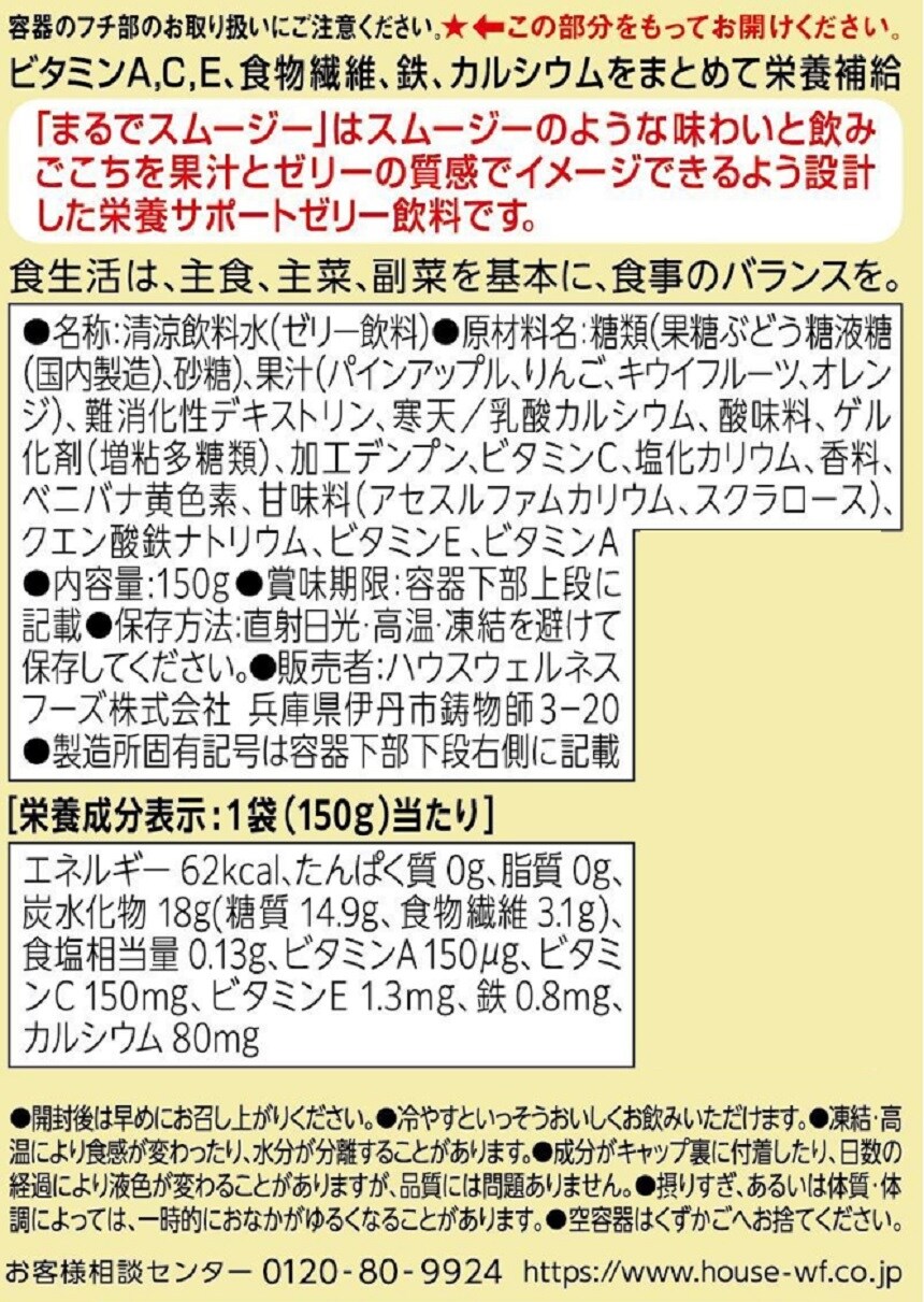 [24個]ハウスウェルネスフーズ まるでスムージー パイン&フルーツミックス味 150g | さわやかなパインの風味と様々な果汁をスムージーのような味わいで楽しめるゼリー飲料
